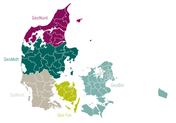 Der eksisterer fem kommunale geodatasamarbejder i Danmark. Geo Fyn, GeoMidt, GeoNord, GeoØst og Sydkort.